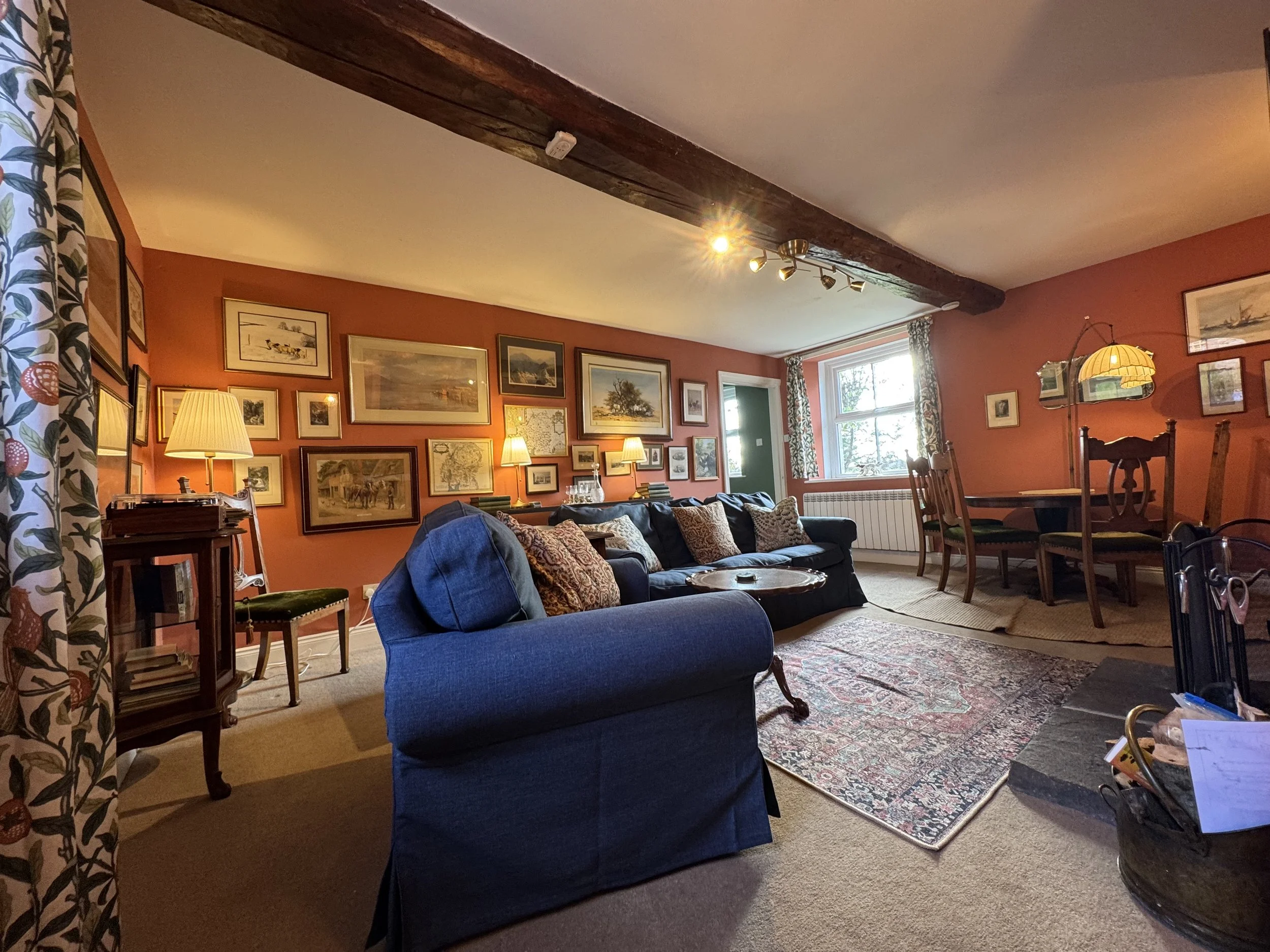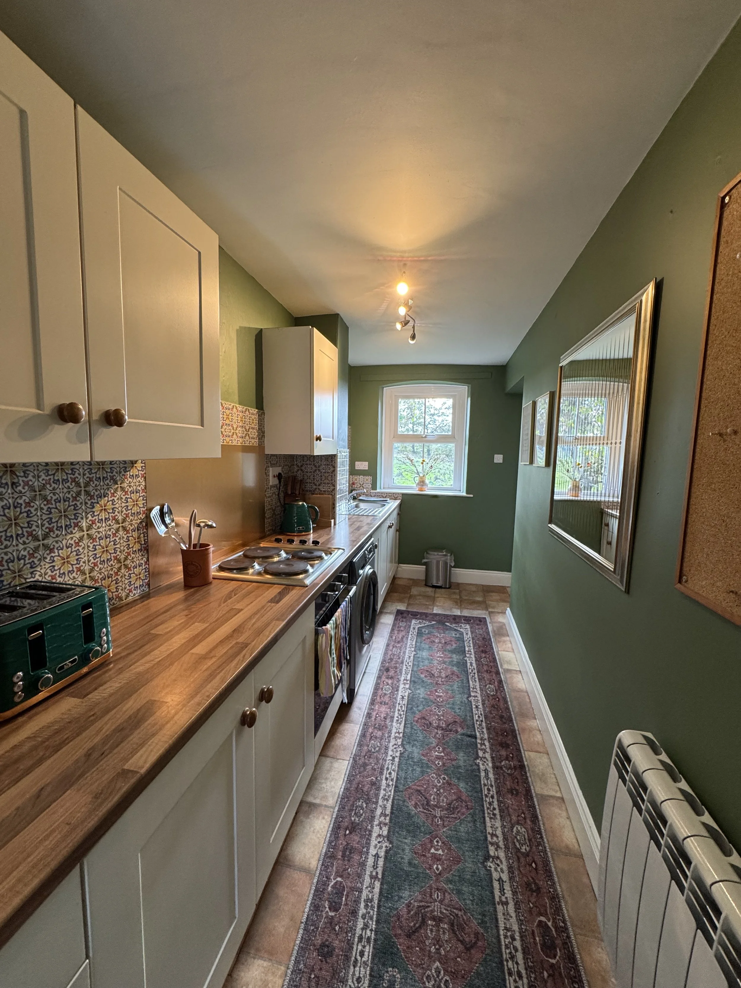 Set next door to 1 Laithes Cottages, this characterful cottage offers 2 bedrooms; one super king and one double bed. The downstairs enjoys a cosy sitting room with dining table - complete with record player and tv. The galley-style kitchen is in the adjacent room.